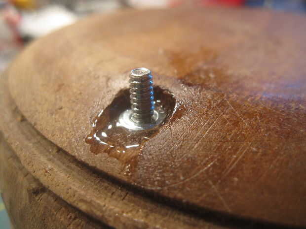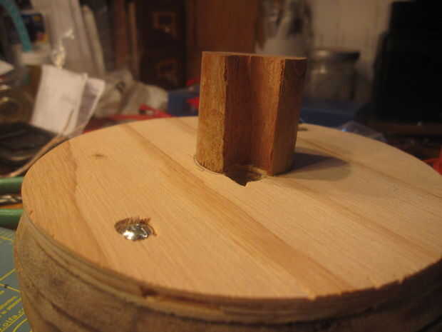 Hicimos un fondo para el tazón de madera contrachapada de 3/8" y rosca en una longitud pequeña de clavija de madera gruesa a deslizarse en el agujero que te aburres en el palillo en el paso anterior (con una muesca cortada para hacer espacio para los cables pasar). Alambré en dos LEDs blancos que parpadeará con los efectos de sonido cuando un hechizo es hacia abajo. (Hecho para un efecto agradable 'relámpago')