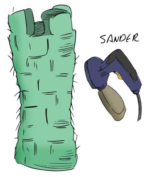 Cuando haya secado completamente la fibra de vidrio. Colóquese guantes resistentes y gafas que ya puede comenzar a cortar todas las piezas grandes que sobresalen. Luego proceder a lijar con papel de lija grueso o una lijadora, ten cuidado no se dañe la almohadilla de la máquina.