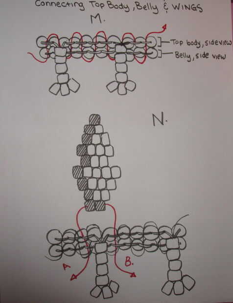 N. ahora que haya conectado la parte superior del cuerpo y el vientre, es tiempo de agregar las alas. Utilice el cable sobrante de las alas para sujetar las alas en las patas delanteras, trabajando a través del cable en el cuerpo superior y el vientre ya conectado como le hago. Utilice el cable de exceso ala para atar un nudo por debajo de las patas delanteras. Repita este procedimiento para ambas alas. Ahora snip.