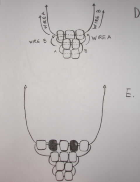 E. ahora es el momento de añadir los ojos! Asegúrese de que son un color diferente del resto del cuerpo de su dragón. Añadir 5 granos a cable A este patrón: cuerpo de color, color de ojos, color del cuerpo, color de ojos, color del cuerpo. A continuación, cable cruzado B a través de todos los granos de 5 en la dirección opuesta. Tire de los cables tensos para agregar la fila.