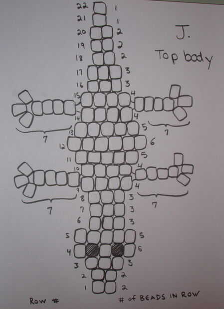 J. continuar agregando filas de granos como lo haría normalmente hasta que su cuerpo se complete. No olvide insertar el siguiente par de piernas entre las siguientes 2 filas de 4 granos. Las piernas siempre se agregan entre dos hileras de 4 granos, el frente y las patas traseras.