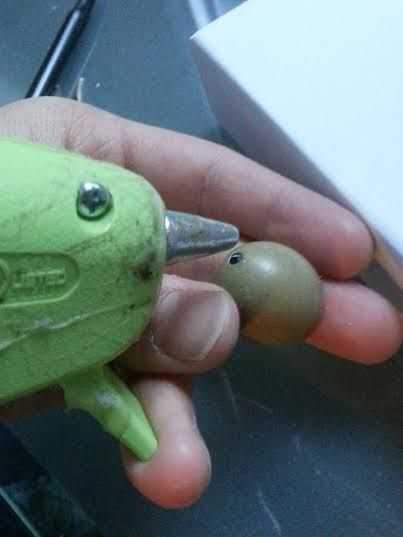 Vas para ser relleno con pegamento caliente así que asegúrese de que sostener el huevo con un guante o algo porque se pone realmente caliente! Llenarlo hasta que se siente completo, utilicé un palillo del pegamento todo para rellenar minas pero variará dependiendo del tamaño del huevo. Cuando el huevo está lleno no se olvide de meter el perno del ojo en todo inmediatamente después de se llene antes de que el pegamento se refresca.