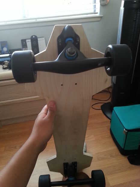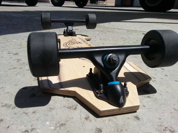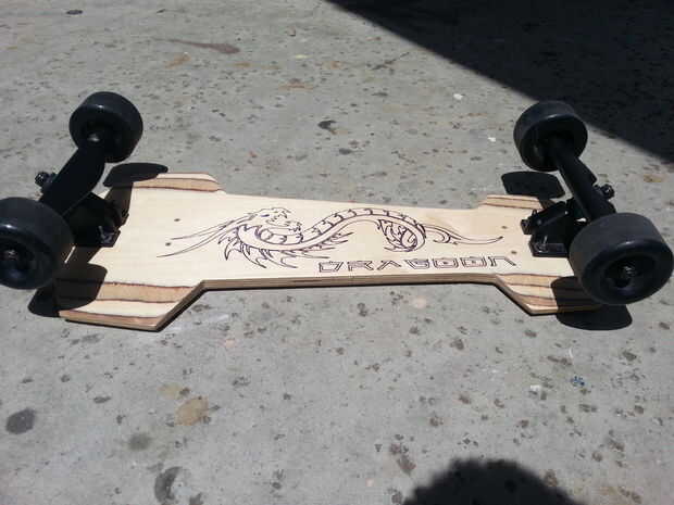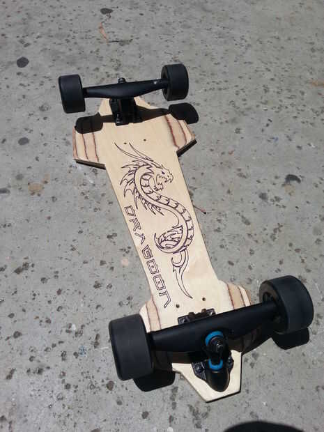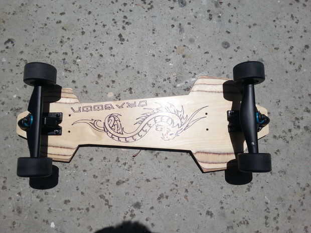 El dragón utiliza un Veloz 5 10" longboard trucks, rodamientos Abec 7 Dragon y genérico 70mm negro de las ruedas.