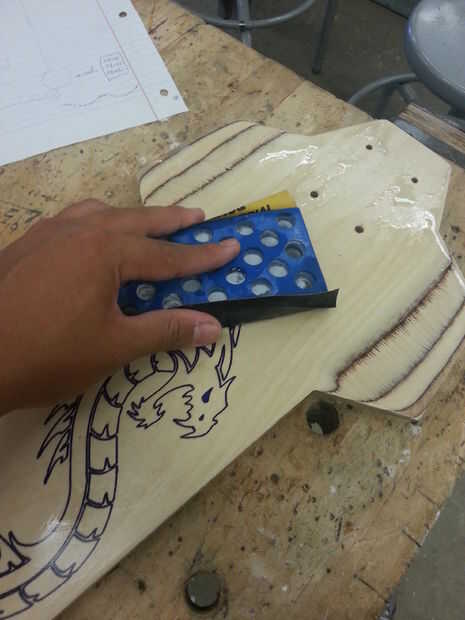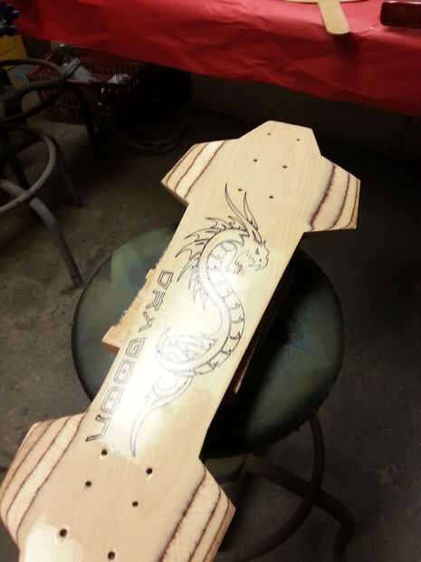 Una vez que se hace chaflán y la Junta es lijar, dibujé en un diseño de dragón y el nombre "Dragón" en la parte inferior de la cubierta con un rotulador.
