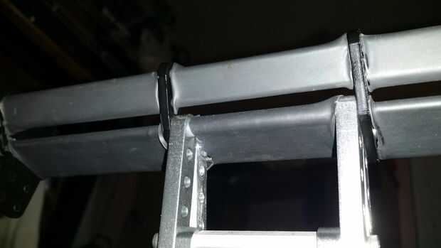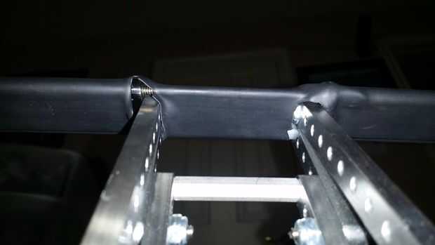 5) tomar el nylocks de la barra principal, deslice 2 allthreads más a través de los orificios superiores de ángulo 2 (usando a más espaciadores de nylon de 1" en la barra inferior), luego tapa apagado con 5 hoyos 45 grados soportes y las placas de derrame, acabadas con nylocks. Luego corte la varilla sobrante.