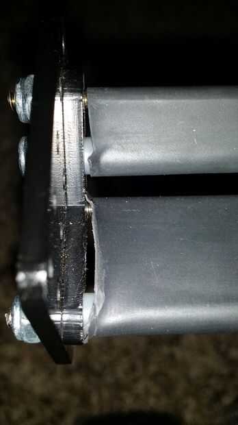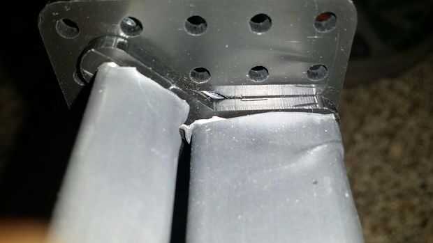 1) usando un perno de 3/4", conecte el extremo de una viga de 21 hoyos a un agujero central de una parte plana del soporte 5 hoyos. Este es el primer punto de fijación. Repita para el otro lado. La cabeza del tornillo está en el lado plástico, nylock del lado de la viga, con el soporte hacia arriba cuando el lado montado es horizontal-como la forma del ala. La idea es que los soportes del marco plástico que fuera de los puntales de montaje.