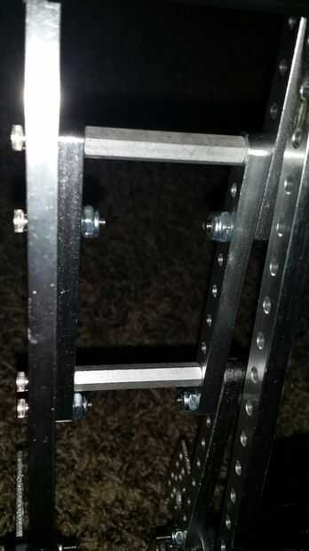 El alerón trasero requiere agregar un par de vigas de 9 hoyos en una forma superpuesta en cada puntal de 7 hoyos. El traslapo superior es 3 agujeros, la base es 2. He añadido los espaciadores hexagonales para mantenerlo todo atado junto.