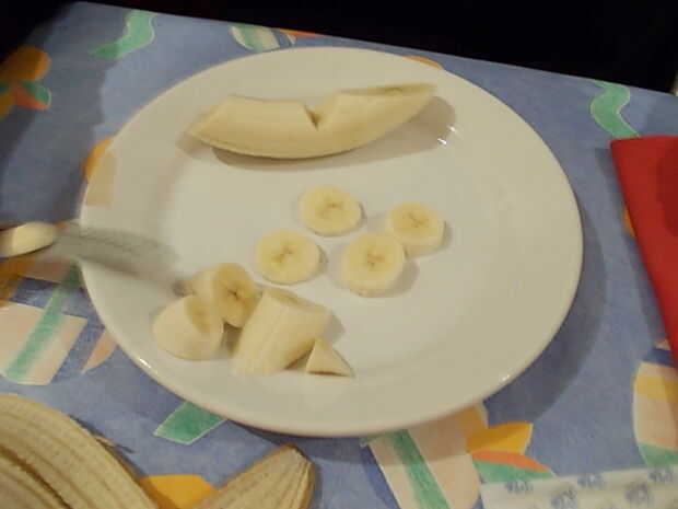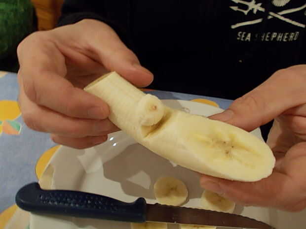 Corte cinco rodajas de banana, dos de ellos para hacer las ruedas traseras y uno de ellos más pequeño que los demás para hacer la rueda de manejo.