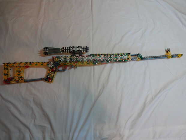 creado en 1963 por la URSS, el Dragunov SVD (Snayperskaya Vintovka Dragunova), o simplemente la SVD, fue una muy robusta y precisa DMR (Rifle de tirador designado). Mientras que mi réplica K'NEX no coinciden (incluso en las normas K'NEX) a la leyenda