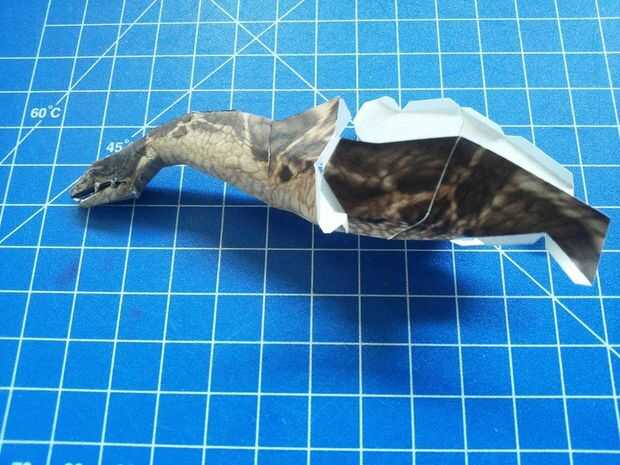 3. Doblar y unir las partes. Usted debe comenzar con la parte más pequeña/detallado y es la cabeza. Trabajar su camino hacia la cola y las alas. Pegar la aleta de la aleta y anillo por anillo. Puede también cortar y pegar directamente una parte a la vez para no perder accidentalmente una parte (pequeña). Puede doblar con una regla, una tijera o un poco ir sobre ella con el cuchillo de corte.