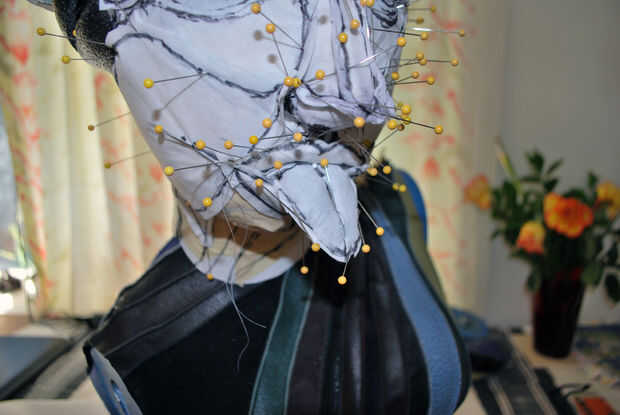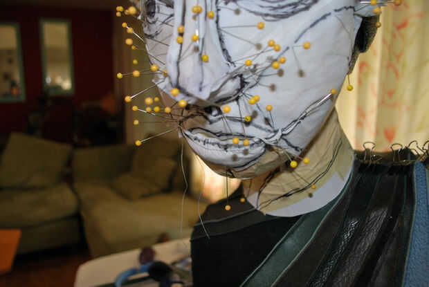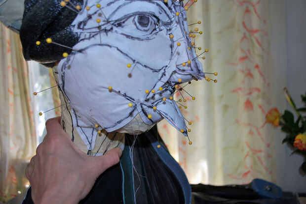 Para cubrir la lengua, comencé con el pliegue del centro. Me cubrió el Pellon en el pliegue y luego alisar los bordes los bordes. Cortar otra pieza de Pellon y libremente lo había clavado en la parte inferior de la lengua y luego cubrió las piezas superior e inferior juntos alrededor de los bordes, trabajando de lado a lado. Después de que fue hecho, revisé el perfil. La curva de la lengua se veía bien, por lo que pasó a la barbilla y el cuello.