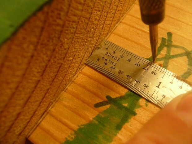 Desmonte para obtener la guía. Encontrar las marcas en la espiga y los agujeros a taladrarse, 1/16" a 1/8" más en la marca. Luego perfore el orificio. Mirar de cerca la tercera foto y verás que el agujero no está bien alineado. Si un taco es golpeado a través de estos que orificios, la espiga se tiró en la mortaja, manteniendo la articulación en tensión. Moví los orificios de 3/32" en. Después de hacer algunos que tienes una sensación de profundidad de lo que es derecho.