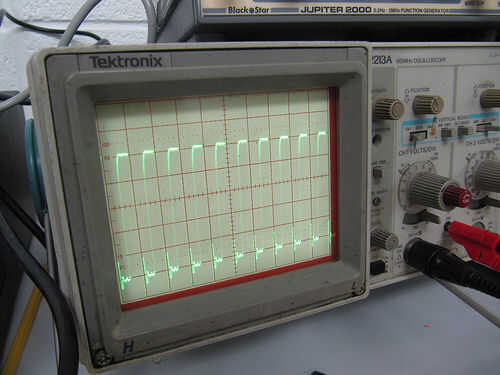 Se revisaron todas las señales de cruce del pequeño "tarjeta principal" a la Junta de motor más grande. Una de las señales alrededor era una señal de 1Mhz (ver la foto). Cortamos la ruta y luego utiliza un generador de señal para inyectar su señal y funcionó! Así que algo de código fue agregado para generar una señal más lenta. Más lento tenemos el plato móvil era aproximadamente 120 rpm antes de que iniciara corcoveos y perder par motor.