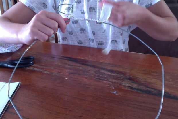 Material rasgar en tiras y luego lazo no a la parte superior de la percha, entonces embalar alrededor de percha uniformemente. Cuando te quedas sin material uso normal cinta adhesiva para pegar abajo y detener de conseguir desentrañar, sabía tira del extremo material y palo abajo abrigo para ocultar pegajosa cinta y continúe envolviendo.