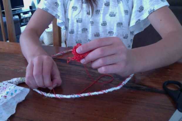 Ahora agarra el hilo de bordar y giro alrededor de percha uniformemente separados. Al llegar a donde empezaste te empiezan a poner el hilo a través de los últimos giros. Como se muestra en la imagen puede bucle algodón y tire a través de la siguiente.