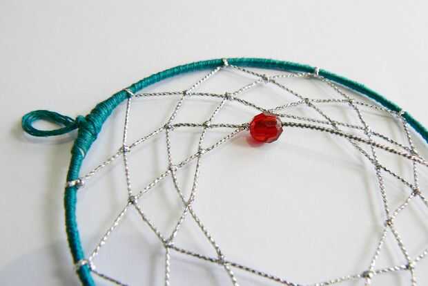 Para agregar un grano en el cazador de sueños, simplemente un grano en el cordón de plata del hilo de rosca y continuar anudando como de costumbre.