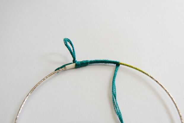 Atar un lazo en el extremo de su hilo de bordar. Pegamento el nudo del lazo en el brazalete para que se la pega vertical y luego usar el resto del hilo de rosca del bordado para empezar a envolver el brazalete, añadiendo una pequeña cantidad de pegamento de artesanía para garantizar.