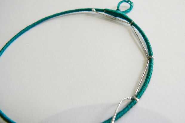 Continuar anudando el cordón alrededor del aro periódicamente, hasta llegar justo antes del nudo de plata original.
