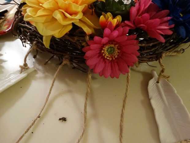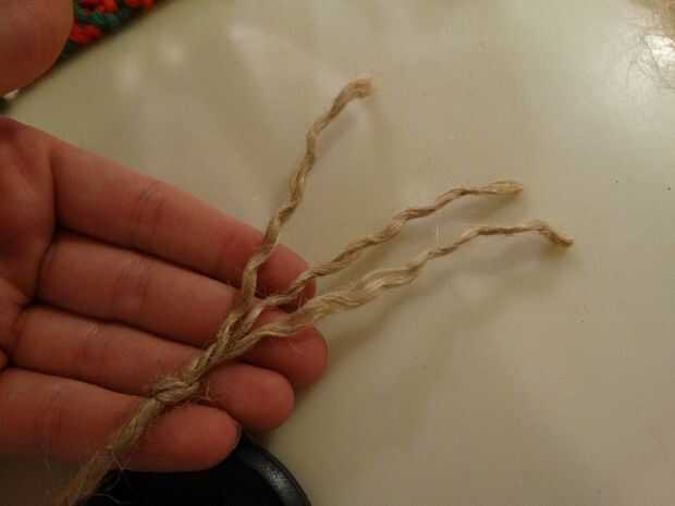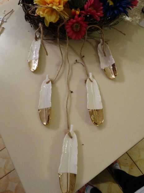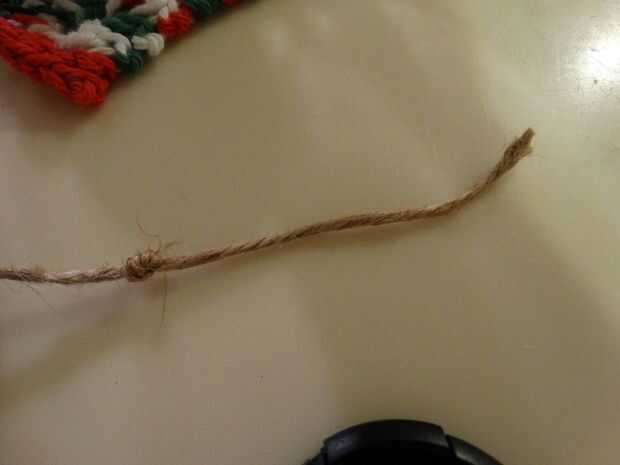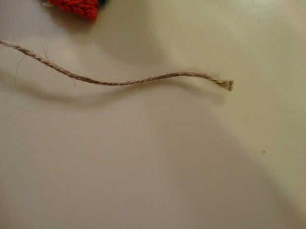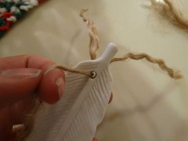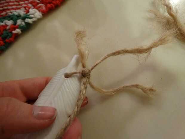 Nota: mi cordel de yute era más grande que los agujeros de los adornos para las imágenes mostraron como desentrañando una parte de él y utiliza las 3 piezas para atar la pluma a la cuerda. A ver lo que tiene y amarre el objeto a la cadena de la manera que hace más sentido para su situación.