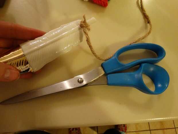 -Si tienes las etiquetas en los objetos, utilice las tijeras para cortarlos. También corte los bucles de hilo de oro que vinieron en los adornos porque no los necesitaba.