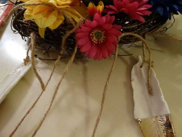 -cortar un trozo de cuerda de la longitud de un poco más de tiempo que desea que su primer objeto para colgar. Colgó la pluma media primero, luego trabajó hacia fuera (basado en el diseño de patrón que elegí que esto hace más sentido)