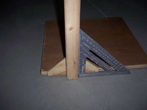 Luego hice dos apoyos triangulares para la estabilidad de los brazos. Había clavado a la base primero, luego atornillar los brazos en eso. Use una escuadra para asegurarse de que van a quedar recto verticalmente. Para la pieza de arriba, usé un pedazo de plexiglás que tenía puesta alrededor. También puede utilizar madera, pero pensé que así podría usarlo ya que lo tenía.