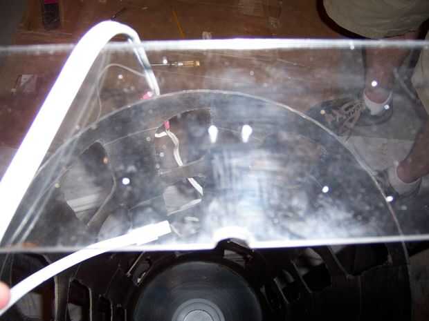 Corte una muesca en el centro de la pieza superior para que el cable se deslice de lado a lado. Cuelgan de la luz del brazo superior para que se sienta cerca de 6 a 8 pulgadas de la parte inferior. Amarre de aquí. También utilicé alambre para mantener segura a la plexi. Ejecute el cable de alimentación a lo largo de uno de los brazos por lo que es fuera del camino.
