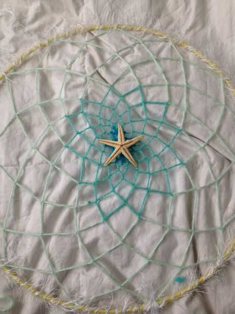 Ahora que termines con el interior del atrapasueños puede decidir un patern en la que le gustaría fijar la cuerda a la parte inferior. Añadir algo que a esta parte como que la estrella de mar por el tema de mar y cuerda blanca esponjosa alrededor de los bordes alrededor de amarillo para dar la ilusión de olas rompiendo en la playa.
