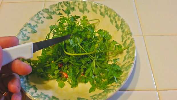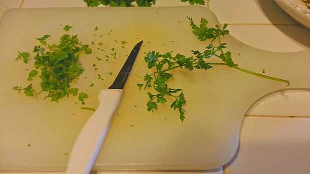 Tomar alrededor de dos tazas de perifollo fresco embalado libremente y pique, tallos y todo. Tomar tiempo para asegurarse de que queden bien picado y no se apresure. Sangre no es una parte de la receta, y así debe hacer su mejor para guardar dentro de ti donde pertenece.