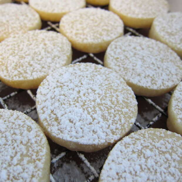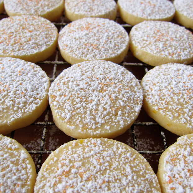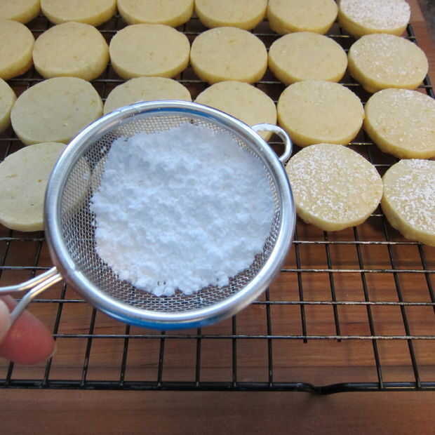 Transferir las galletas a una rejilla de alambre. Mientras que las cookies son todavía caliente ligeramente polvo con azúcar en polvo con un colador pequeño.