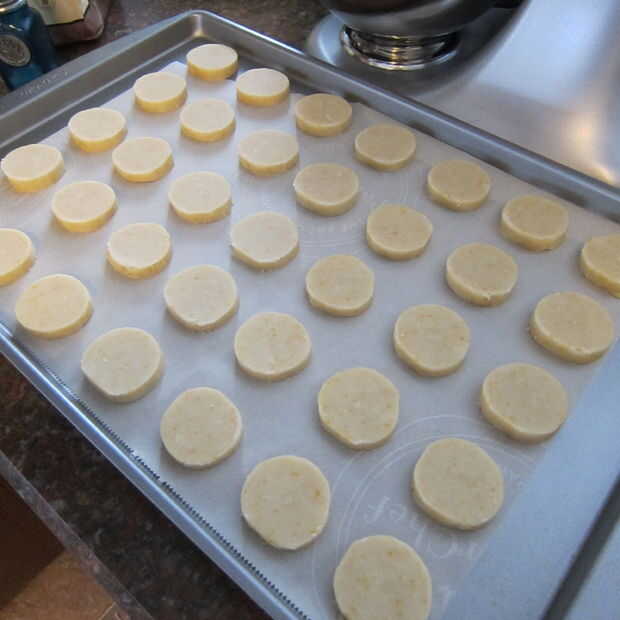 Coloque la masa sobre una tabla de cortar y usando un cuchillo afilado cortar troncos de 1/4 de pulgada rodajas. Arreglar las rodajas en un pergamino forrado para hornear y hornear 10-12 minutos.