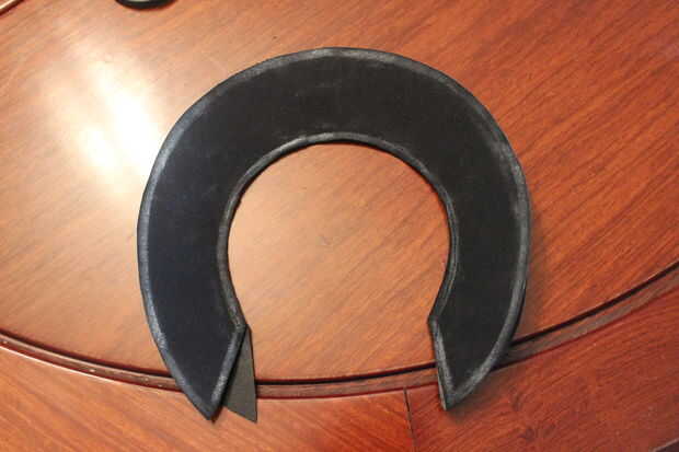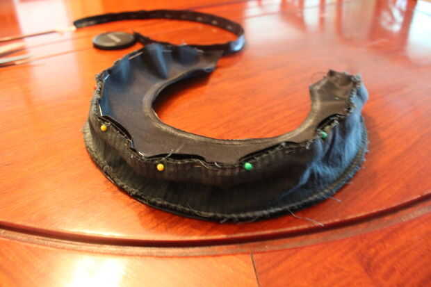 Cortar el material con unas tijeras, también necesitará más de su cuero tuberías así que tiene una buena longitud de que en la mano así (la tubería de cuero va alrededor del borde exterior de la "U"). Una vez que todo se corta puede comenzar a coser! Asegúrate de coser todo adentro hacia fuera para que usted obtenga bordes limpiamos agradables. Primero tomar las dos piezas en forma de "U" y el interior los bordes juntos, asegúrese de que tener a los lados superiores de la piel artificial frente a unos de otros por lo que usted está cosiendo este revés del perno. Una vez que han cosido en el interior borde de las piezas también coser uno de los rectos los bordes en la parte superior de la "U", deja el otro como esto le permitirá rellenar el collar más tarde. (seguir haciendo referencia a las imágenes de arriba para ver lo que me refiero si no está claro)