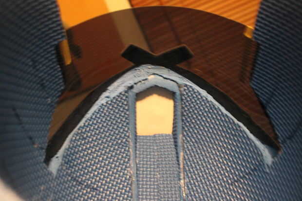 Una vez tengas la pantalla cortar uso el cuchillo stanley corte a lo largo de los bordes del casco donde se sentará el visera, asegúrese de que dejar alrededor un borde de 3mm entre el borde exterior y su corte. Una vez que han cortado en los bordes van dentro del casco y rebanada a la espuma en exceso, esto debe dejar un borde que puede pegar la pantalla. (imágenes de referencia arriba) Usar pegamento para pegar la pantalla en su lugar, esto proporciona una sujeción fuerte y sólo toma unos segundos para fijar! Pegamento ciertas partes de la pantalla abajo primero con pegamento caliente para fijar antes de usar pegamento. Asegúrese de que su visera se pega en forma pareja en ambos lados! medida cómo lejos abajo te pegue con un gobernante como usted puede ver en una de las imágenes de arriba.