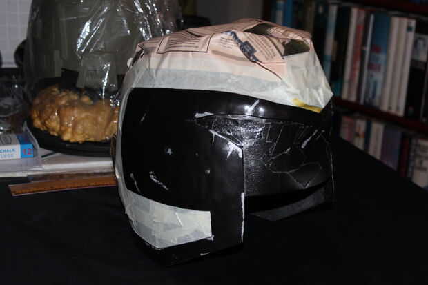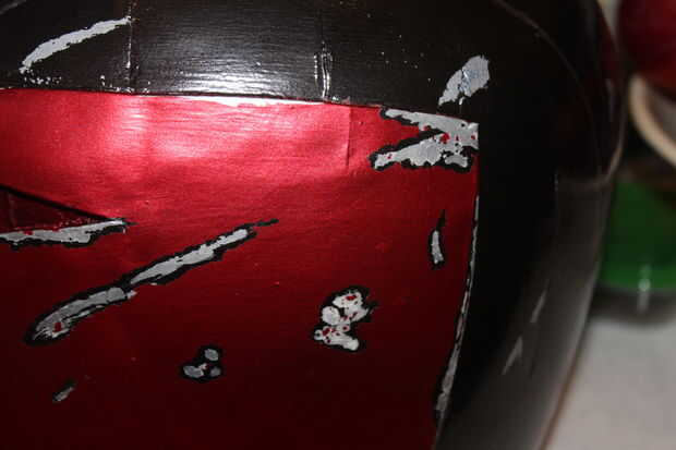Luego máscara las partes del casco que no se significan para ser rojo, para ahorrar en el uso de la cinta puede usar diario para cubrir el área más grande. Luego pintura más vaselina ontop de la zona de pintura desconchada, asegúrese de ir fuera de la zona desconchada ligeramente para que la próxima vez que limpie la vaselina mostrará algunos pintura negra alrededor de la plata.