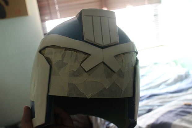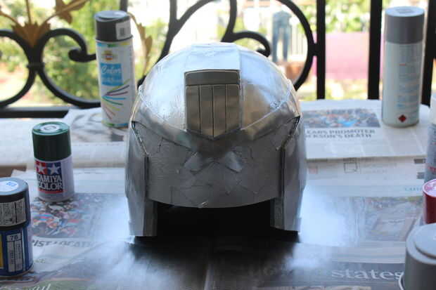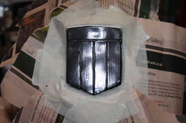 Añadir la capa final de pintura de aerosol mascarilla todo excepto la insignia para que luego usted puede rociar pintura de oro en la parte superior. Deje que esta pintura oro fijada para una hora más o menos por lo que es totalmente seco.