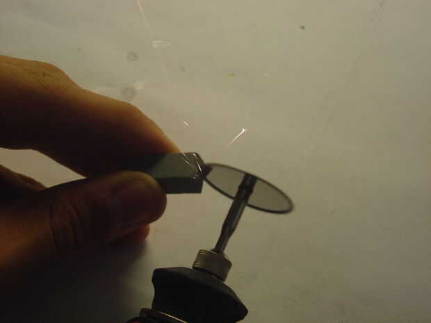 después de hacer así que encienda el dremel y sostener la piedra de moler en el borde de la placa y aplique presión de minero, haciendo hacemos red la placa por lo que es perfectamente redondo y centrado.
