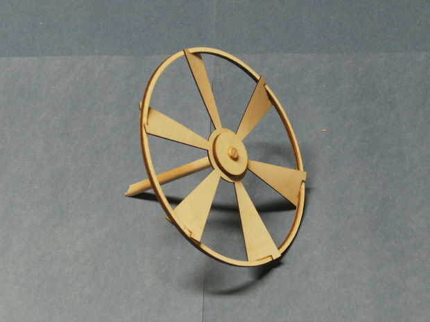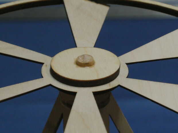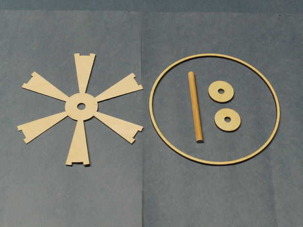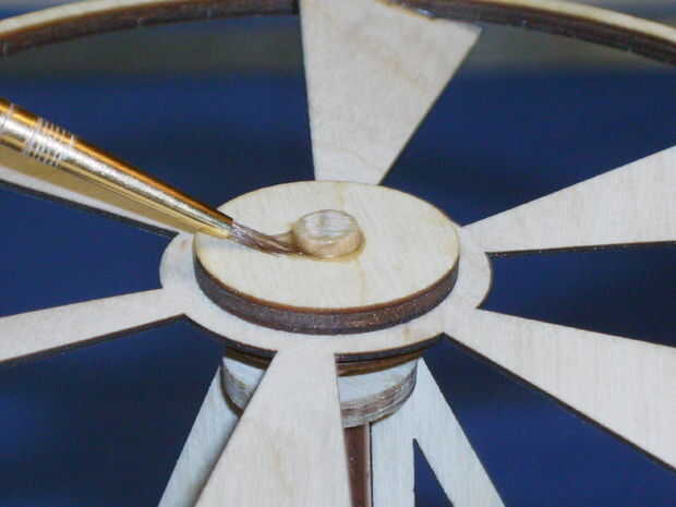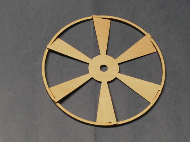 Foto #3 que el borde se une a las paletas del ventilador girando suavemente cada hoja así que lengüetas en el extremo de cada lámina se extiende por el borde, después se pegan los discos de cubo del ventilador uno a cada lado. Luego con una pequeña brocha aplicar un filete pequeño de pegamento por todas partes las aspas del ventilador toca el borde.