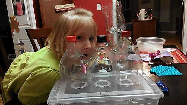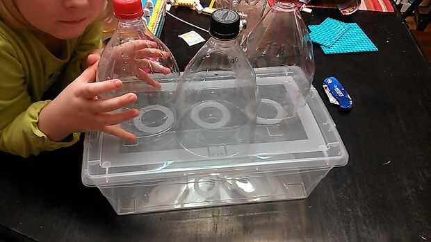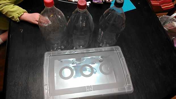 Una vez tengas el fondo cortado, los invierta y traza un bosquejo en torno a las botellas en la tapa. Esto le dará el dibujo de donde cortar los agujeros.