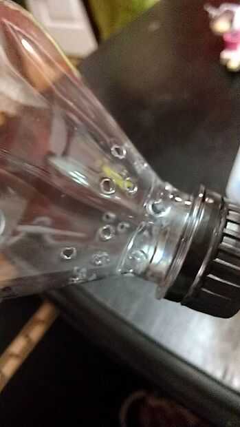 Recorta el patrón que creó en el paso pasado y utilice la herramienta de poker o cuchilla para cortar los agujeros en la parte superior (inferior)? 2 pulgadas o tan cerca de la tapa de soda. Duele no hacerlo tan alto como el punto donde toca la tapa, pero es innecesario. Estos agujeros son para drenaje del agua hacia arriba. Si su suelo no se absorbe el agua, puedes agregar más agujeros más adelante.