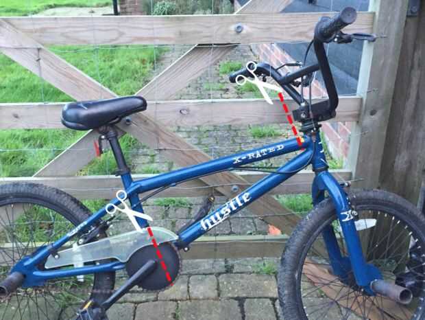 - Cortar el cuadro por las líneas punteadas en el pic. Todo lo que quieras es la pipa y la parte delantera de la bicicleta completa. He utilizado una sierra de mano para esto e hizo realmente fácil el trabajo de él