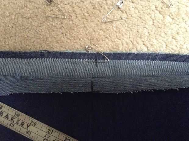 Observe también que coser todos para las costuras se hace en la parte posterior (el lado oscuro del dril de algodón azul en mi caso). Si ves el acabado frontal, está cosiendo mal. Coser el dobladillo se realiza en la parte posterior también, pero está cosiendo el lado acabado contra la parte trasera. Verás lo que quiero decir cuando trabajas con él. Hemming correcta es más obvio que el coser las costuras.