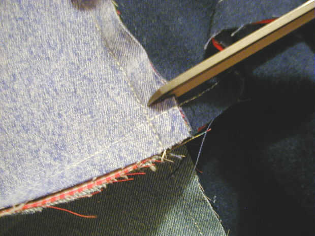 Al lado del dril de algodón y con clip de unas tijeras afiladas apagar todas las costuras de los expuestos aproximadamente 1/2" de distancia teniendo cuidado de no cortar el hilo de coser. Este proyecto es bastante perdonar por lo que si le sucede por accidente, la zona de la puntada corta IN un poco más de la 1/2". Probablemente no mostrar por el desgaste.