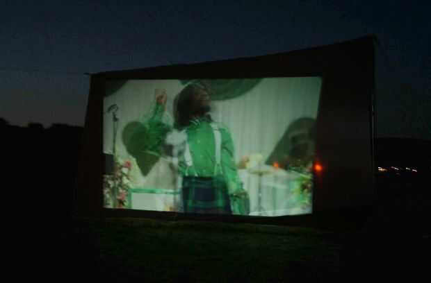 Quería que esta pantalla para ser visto desde ambos lados, por lo que podría tener a la gente ver desde una fogata de la parte posterior y de sus coches desde la parte delantera. Para el audio he utilizado un transmisor de fm elevado diez pies del suelo. La pantalla se hizo de dos hojas de doble cosidas.