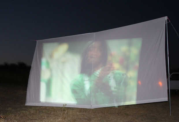Uso de hojas no es generalmente el mejor método para conducir-pantallas pero en esta aplicación es la forma más fácil para el proyector a brillar a través de la pantalla por lo que era visible en ambos lados. Para hacer que la pantalla me cosida 2 hojas, en la parte superior e inferior cosí las correas por lo que pudiera atarlo al poste y estaca en el suelo. Es un poco difícil de explicar cómo cosí la pantalla así que mire a través de las imágenes. Las correas se pliegan sobre para que la pantalla está dentro. Para coser juntas las 2 hojas corté los bordes doblados porque eran demasiado gruesas. Cosida 2 hojas con una puntada recta hacia abajo, cortar el material extra, continuación, utiliza una puntada muy zigg-llegamos a apretar en el borde suelto de modo que no desentrañar.