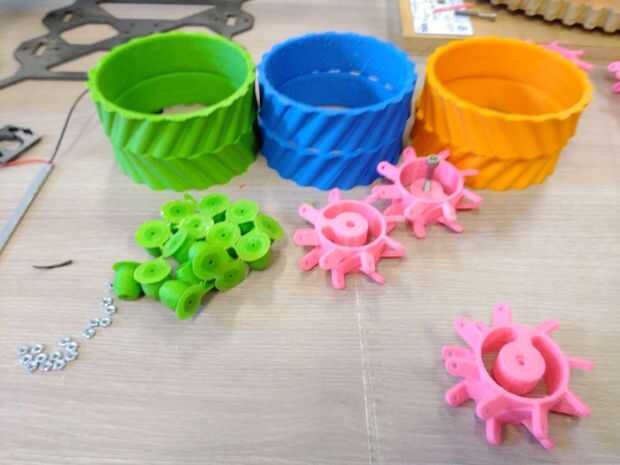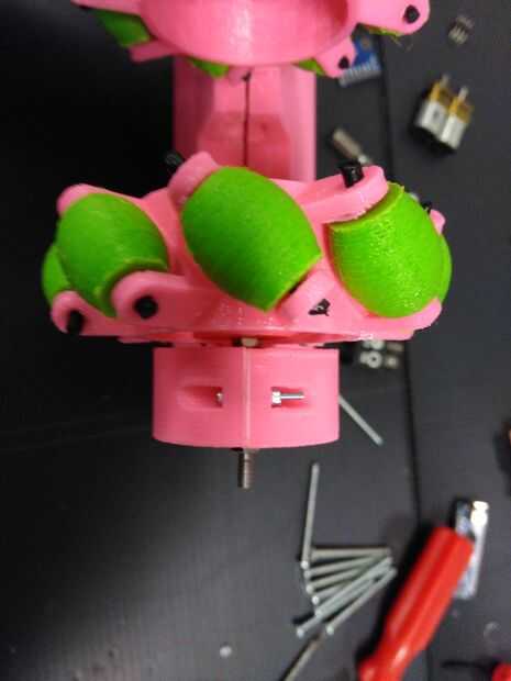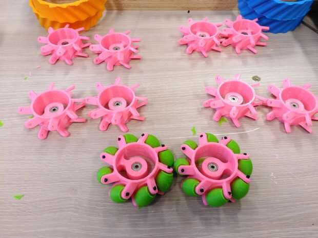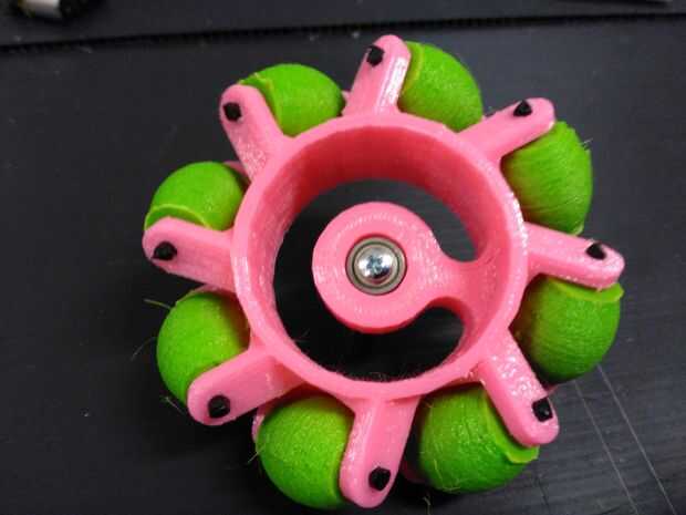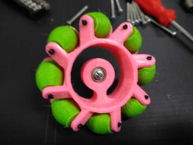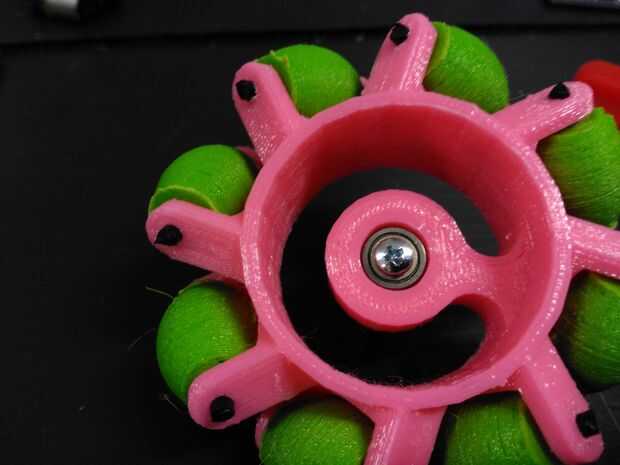 Para montar las ruedas de Omni que necesita para tomar hacia fuera las estructuras de soporte de la llanta trasera. Utilizando una broca de abrir los agujeros de 3mm (16 agujeros en total por llanta). Necesita necesita cortar 5cm del filamento ABS de 3mm, esta parte servirá como un tor eje neumático.