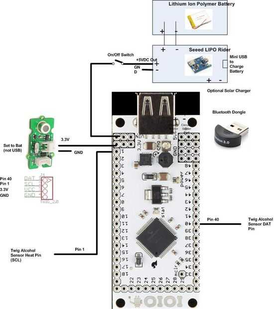 El jinete de LiPO de Seeed saca los 3,3 v de la batería de LiPO y salidas de los 5VDC que el IOIO necesita para funcionar. Conecte cualquier cargador estándar de USB en el puerto USB en el jinete de LiPO de Seeed para cargar la batería.