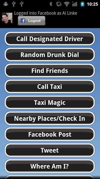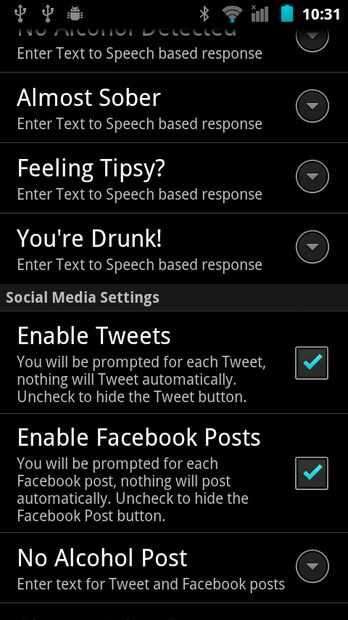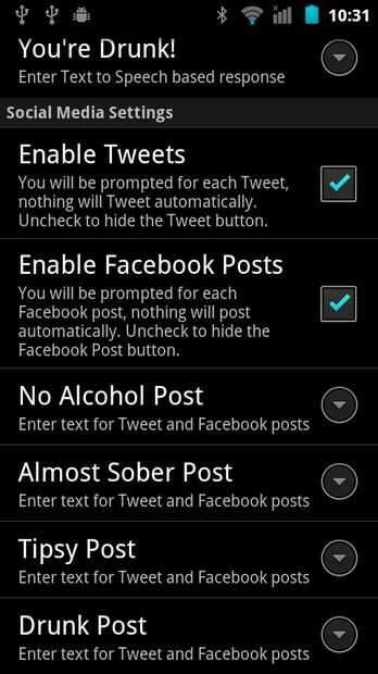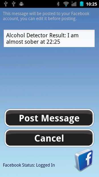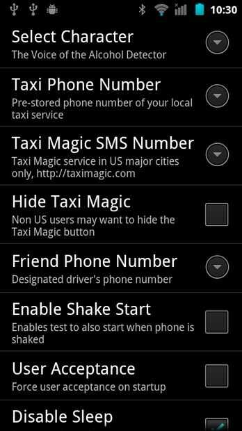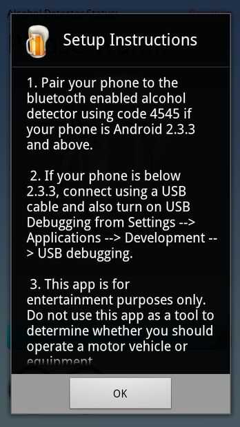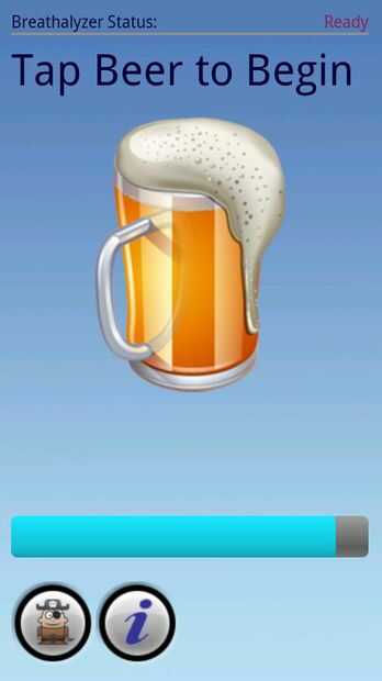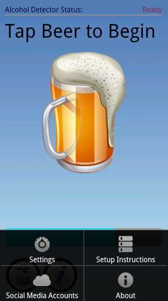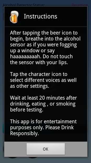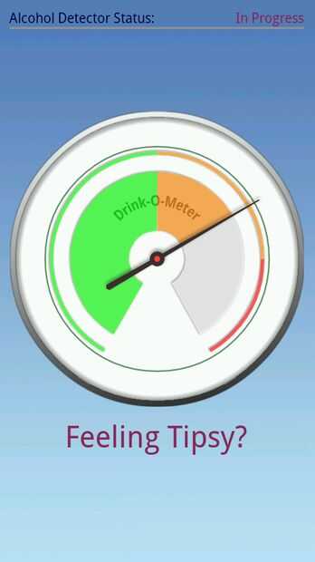 Tenga en cuenta que el Droidalyzer no es un alcoholímetro profesional y es para fines de entretenimiento (i, e, diversión) y de ninguna manera debe utilizarse para determinar si uno debe conducir después de consumir alcohol. No salida de BAC pero algo salidas de 4 niveles de consumo de alcohol: No detecta Alcohol, casi sobrio, Tipsy y borracho.