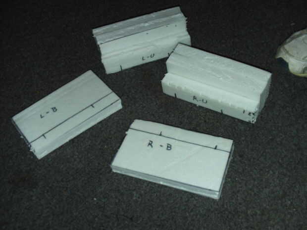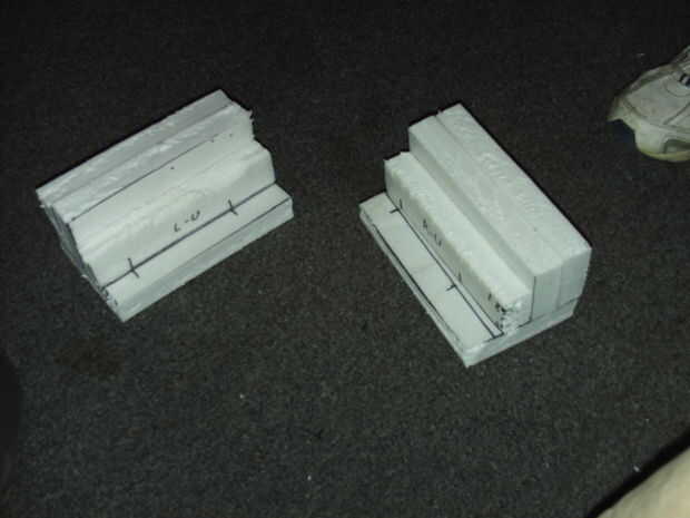 Los pies tuvieron que ser cortado y apilado para obtener el espesor requerido y espacio para las piernas encajar.  Usé cola blanca para sostenerlas mientras que forma con el archivo y papel de lija.  Haz grabados con lo barato también.