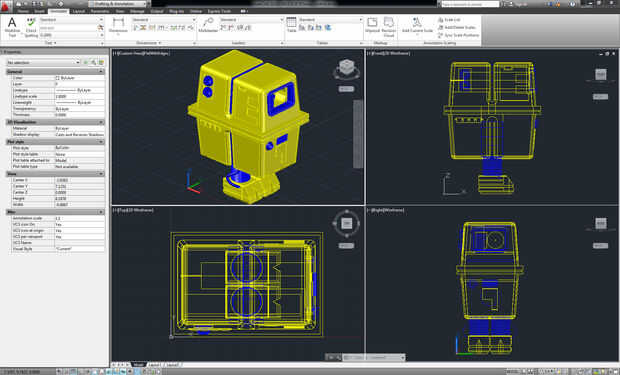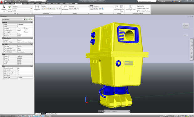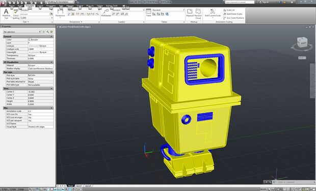 En definitiva, quería las piernas para ser flexible, por lo que he creado el modelo con dos materiales en mente, uno rígido y otro flexible. Para destacar algunos detalles, utilicé el material flexible, así como "adorno". En el modelo ACAD, puede Ve el material del cuerpo rígido en amarillo y el material flex para piernas y recortar en azul. Estos se mantuvieron como objetos separados.