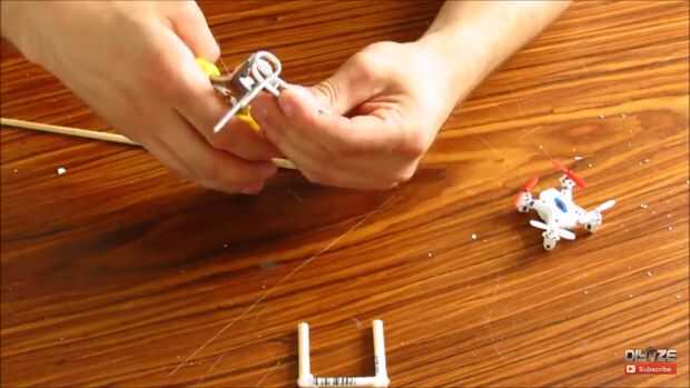 Ahora sólo podría hacer dos puestos en la parte superior del barco y adjuntar drone a ellos, pero resultaba tan zángano se levanta en posición de seguir adelante como se ve en el vídeo. para esto que acabo de hacer un pequeño mecanismo que permite drone a levantarse a 90 grados. No sé cómo llamar a este mecanismo, sólo construirlo fuera de 3 espigas de madera y barra de aluminio doblado en forma de y 90 grados de ángulo.